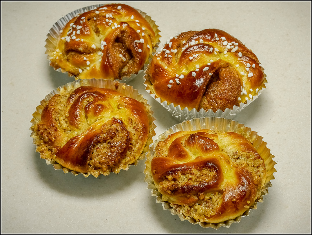 Use a pastry brush to lightly coat the buns with the beaten egg. Sprinkle each bun with cardamom and pearl sugar.