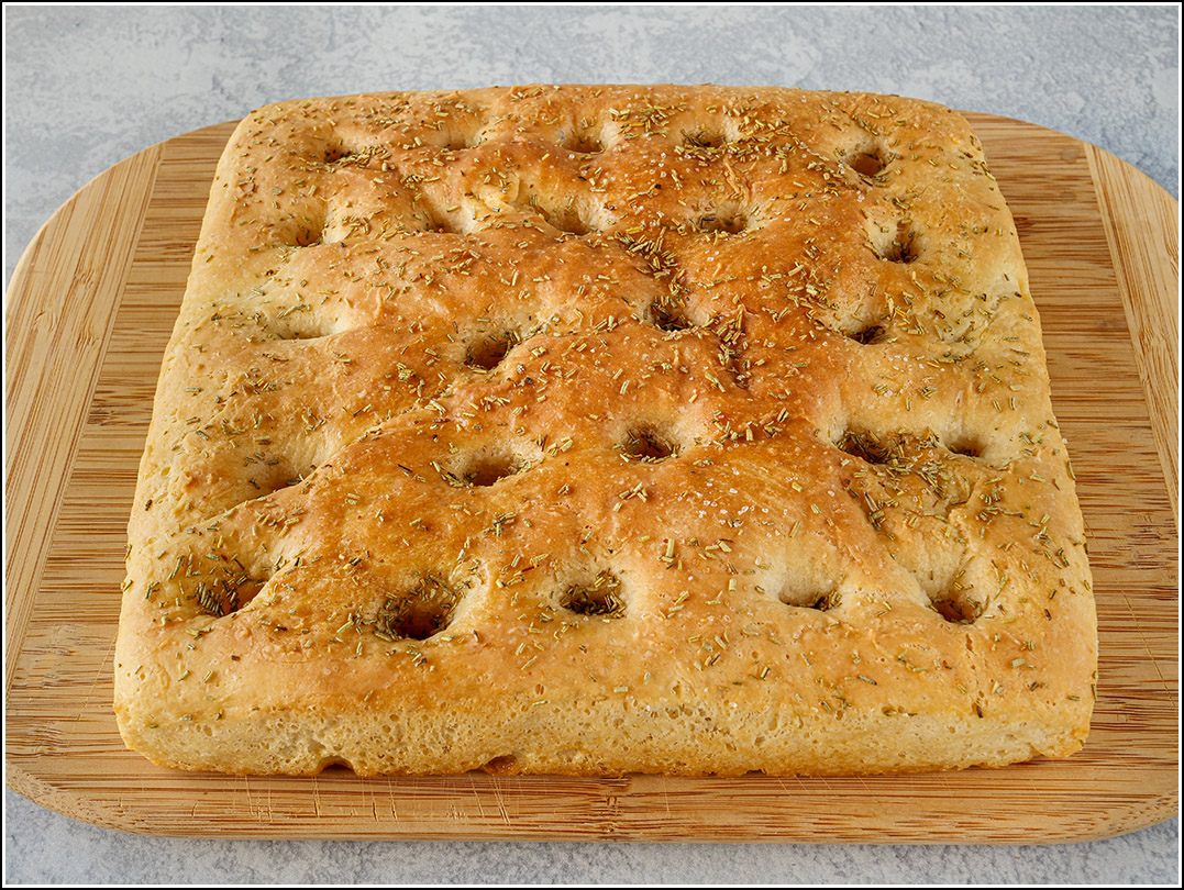 This is based on an old King Arthur Flour recipe, Blitz Bread: No-Fuss Focaccia that my mother used to make all the time. I've cut the recipe in half so it fits an 8x8-inch pan. This is very tasty, so easy to make, and always comes out perfectly. It's also very versatile: add any herbs for toppings, or even add them (or something like cheese powder) in with the dry ingredients. I like this with sea salt and fresh rosemary on top.