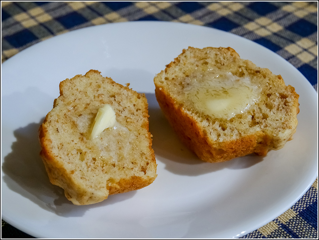 - Bake on rack 2 for 18-20 minutes, until a cake tester inserted into the center of a muffin comes out clean. Remove from oven and tip the muffins in their pan so the bottoms don’t get soggy. After 5 minutes, remove muffins to cooling rack. Serve plain or with butter and/or jam.