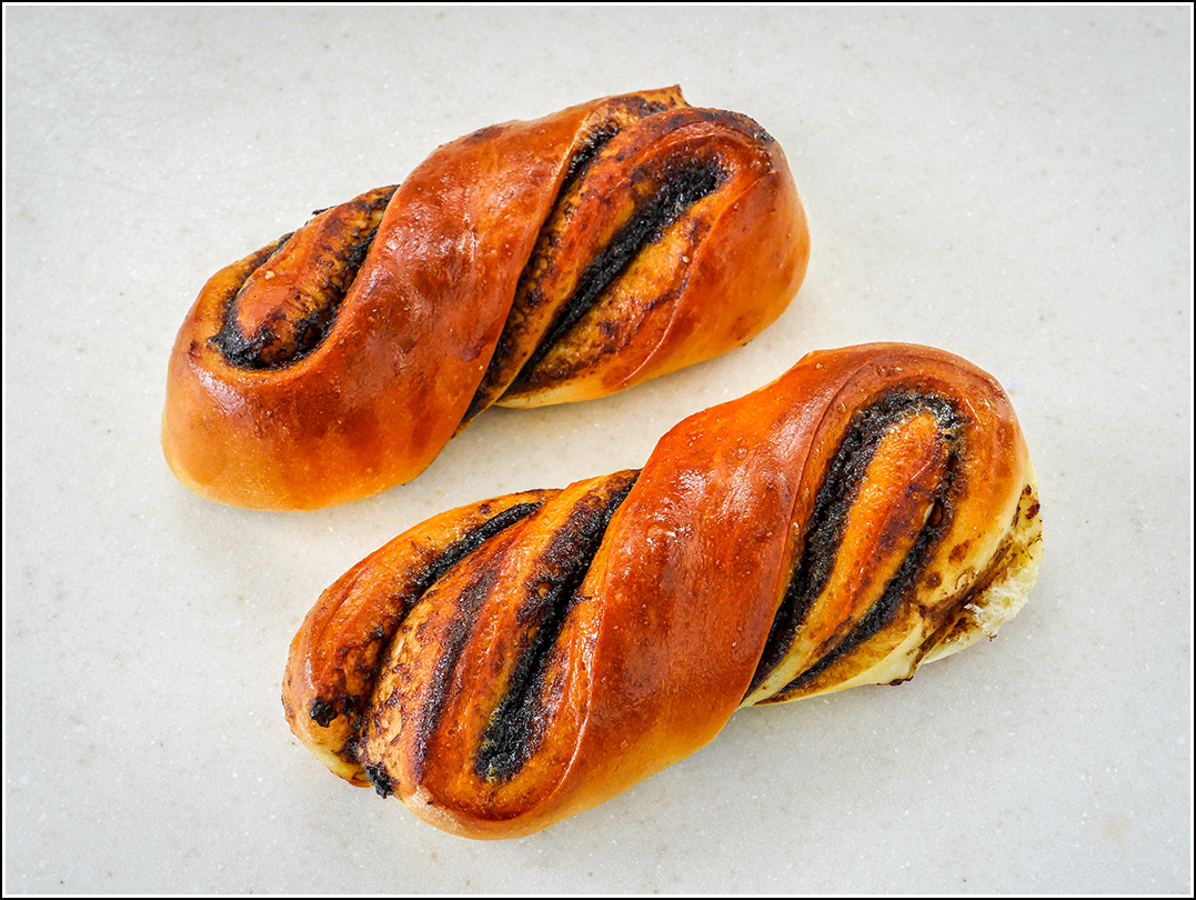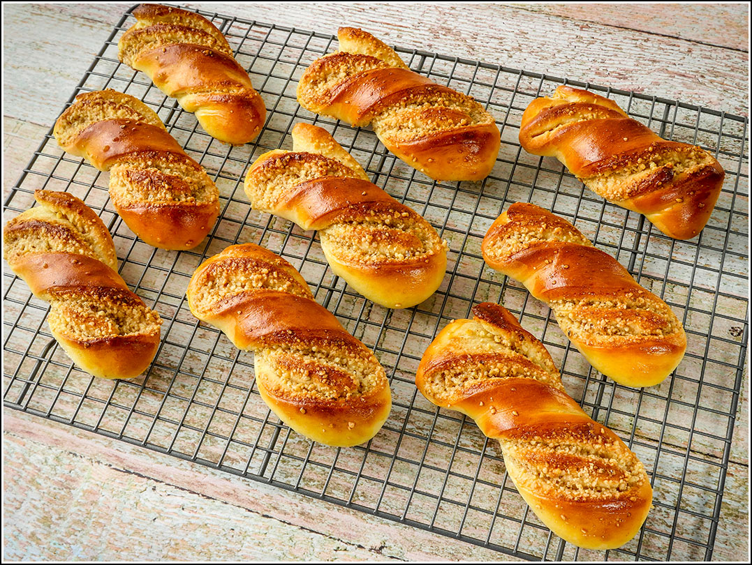 These are fantastic made with salted Kerrygold Irish butter! It works to make up the full recipe of sweet dough but use only half at a time, refrigerating the other portion for a few days. If using half the dough, roll out to an 9x12-inch rectangle (or 9x9 square is fine, because the dough tends to pull a bit when folding it over the filling) and cut into 9 rolls. Also works well with a nut filling: grind 4 ounces of nuts and add to ¼ cup sugar. Half of the dough also works perfectly with the King Arthur Flour bun pan. Roll into a 16x8-inch rectangle, add filling, roll, and cut into 6 slices. Let rise 45-60 minutes, and brush with egg wash. Bake at 375°F for about 16 minutes (I raise the rack up one from where I usually have it so the bottoms don't burn), tenting with foil if browning too quickly. This also works well with apricot lekvar as a filling; in that case I twist the buns as I do the cardamom buns.