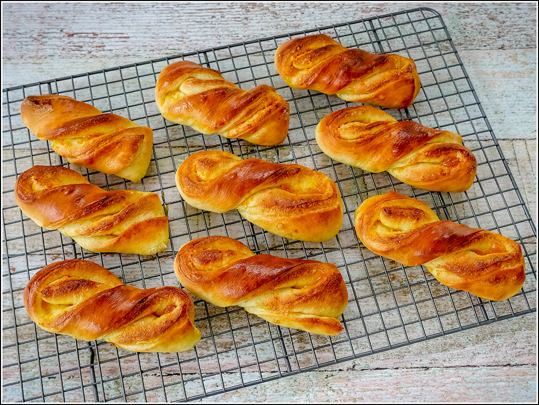 20 May 2025: Made these today for the first time in quite a while. I didn’t have any oranges, so I used the chopped walnut/sugar filling for 5 of the rolls and strawberry cream cheese filling for the remaining 4. The filling ingredients are:
