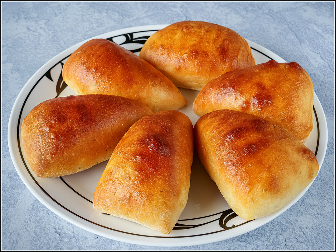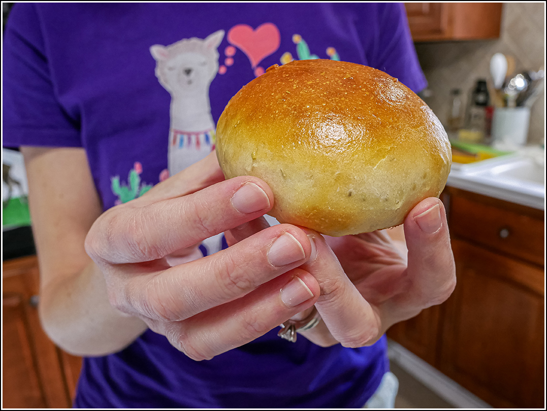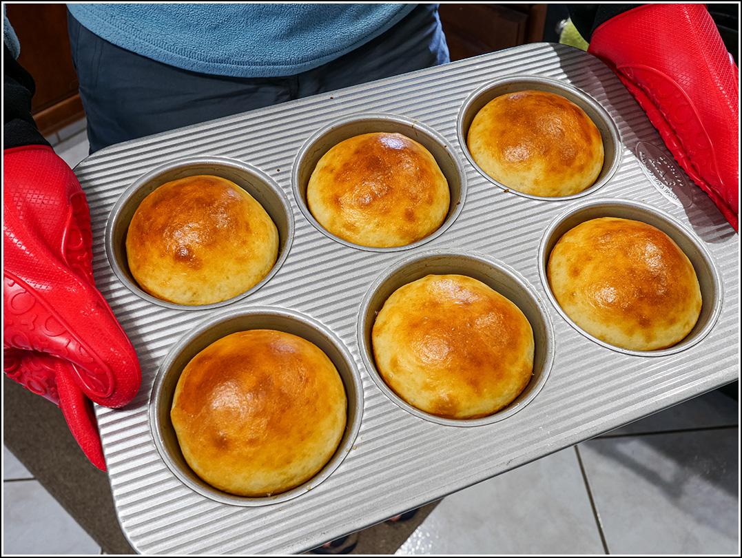 9 December 2023: Today I made these rolls in the 8-well “micro-loaf” pan. I kept all of the recipe proportions the same. Each bun weighed 63 grams. Baked at 375°F on rack 2 for 14 minutes, rotating the pan after 10 minutes.